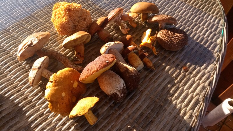 Steinpilz, Birkenpilz, Marone, Pfifferling, Sandröhrling, Glucke, Butterpilz, Habichtspilz, Kuhroehrling, Hexenroehrling und falsche Rotkappe waren dabei und sicher haben wir essbare Unbekannte noch angetroffen, die stehen bleiben durften.