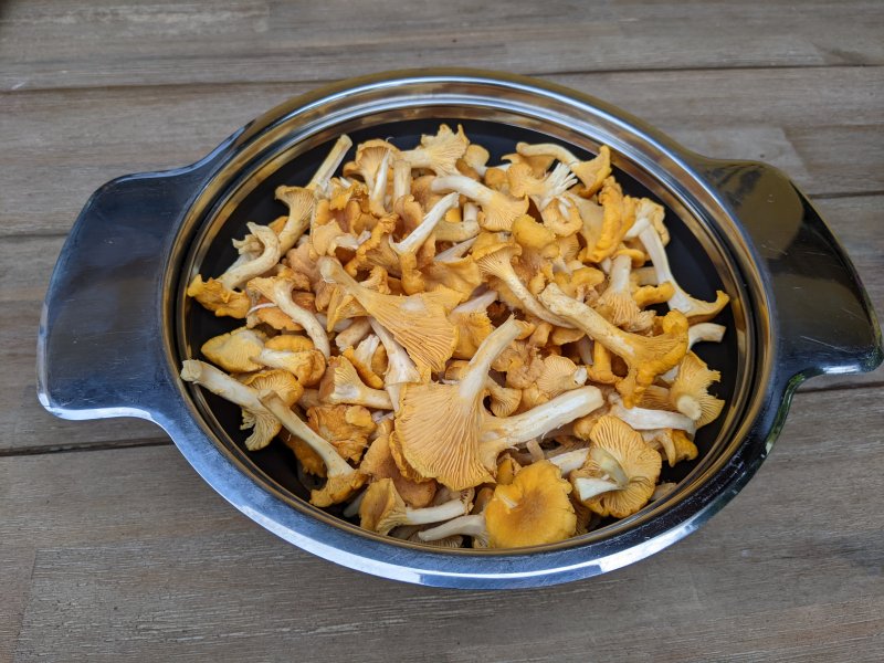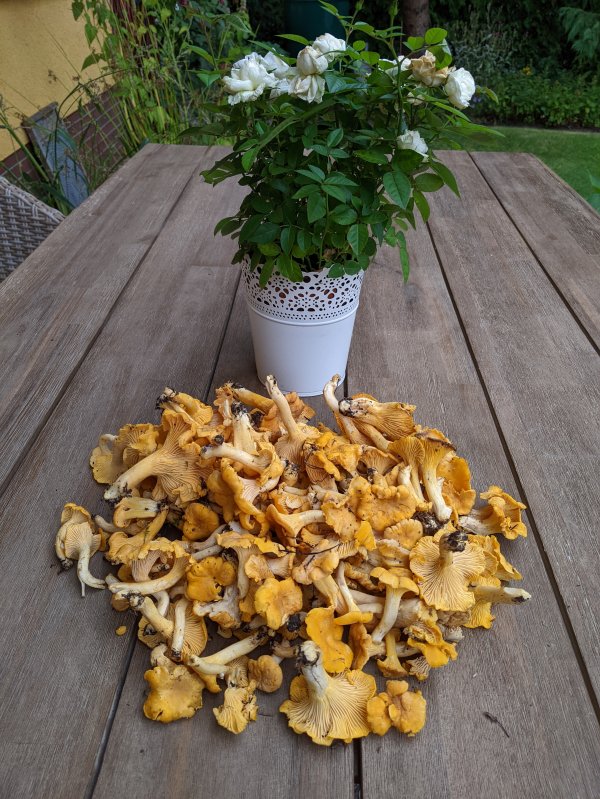 Bei uns sprießen die Pfifferlinge auch sehr gut. Heute haben wir ein ordentliches Sieb voll gefunden. Eine Portion gibts Sonntag im Rührei, eine Rühreiportion wird eingefroren und den Rest bekommt mein Onkel, der sich als leidenschaftlicher Pilzsammler nach hoffentlich baldiger Schlaganfallreha eine Portion Pfifferlinge gewünscht hat.