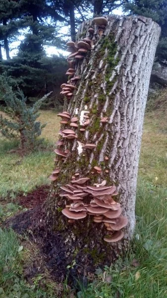 Im vorigen Jahr wuchsen sogar auf der Schnittfläche zuerst Samtfussrüblinge und dann die Austernseitlinge, dieses Jahr aber bis jetzt nur die Austernseitlinge.