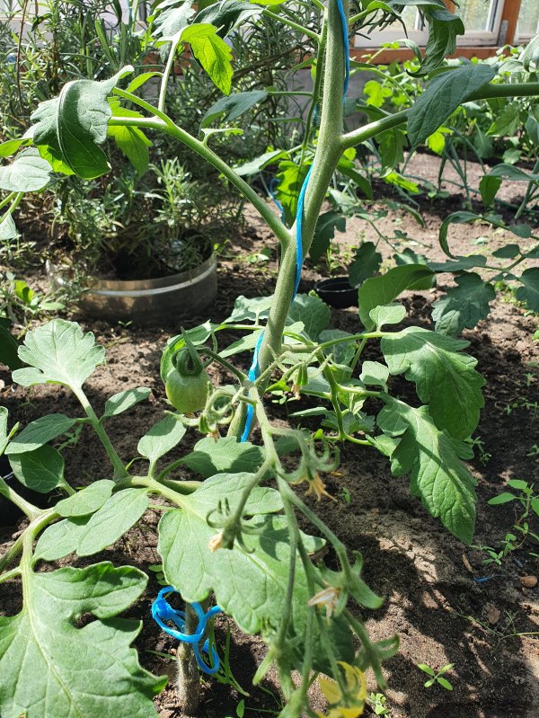 Wochenende habe ich die Tomaten angebunden, mit Tomatenhaken ist das ein neuer Versuch.