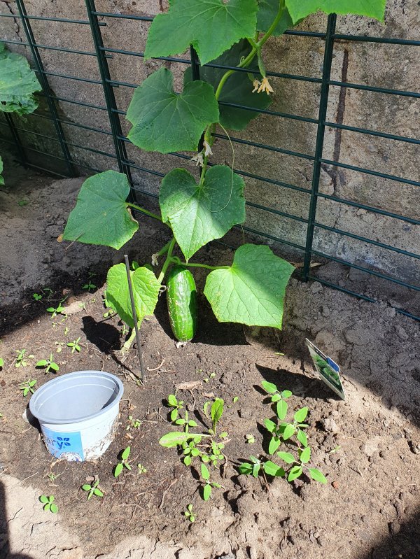 Ich habe heute das erste Tomatchen entdeckt und eine Gurke ist auch schon.