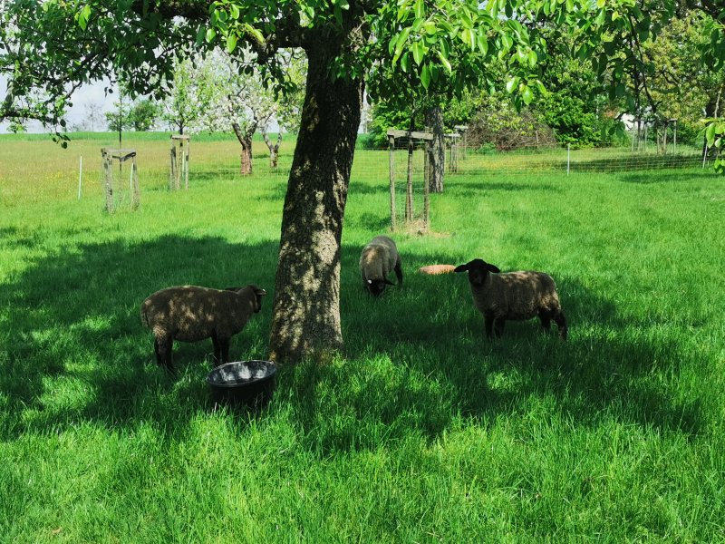 Seit Anfang Mai sind auch unsere diesjährigen Saisonarbeiter eingetroffen. Ihr Aufgabengebiet ist die Pflege der Streuobstwiese. Obwohl sie sehr fleißig sind schaffen sie ihre Arbeit nicht. Derzeit wächst das Gras extrem schnell und ich muss wohl mit dem Rasentraktor unterstützend eingreifen...