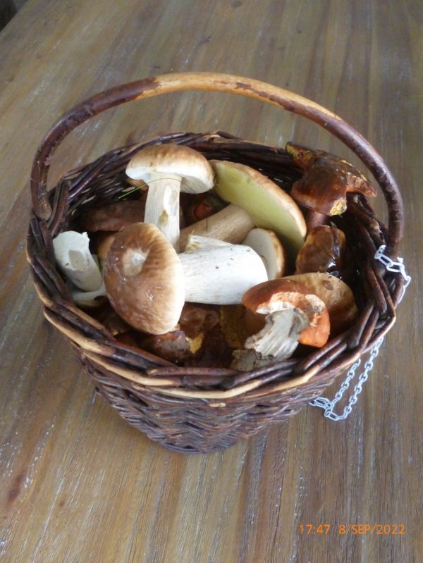 Steinpilze, Hexenröhrlinge und eine Rotkappe. Die grauen Wulstlinge durften im Wald bleiben. Nur die Maroner fehlen ganz. :a020: