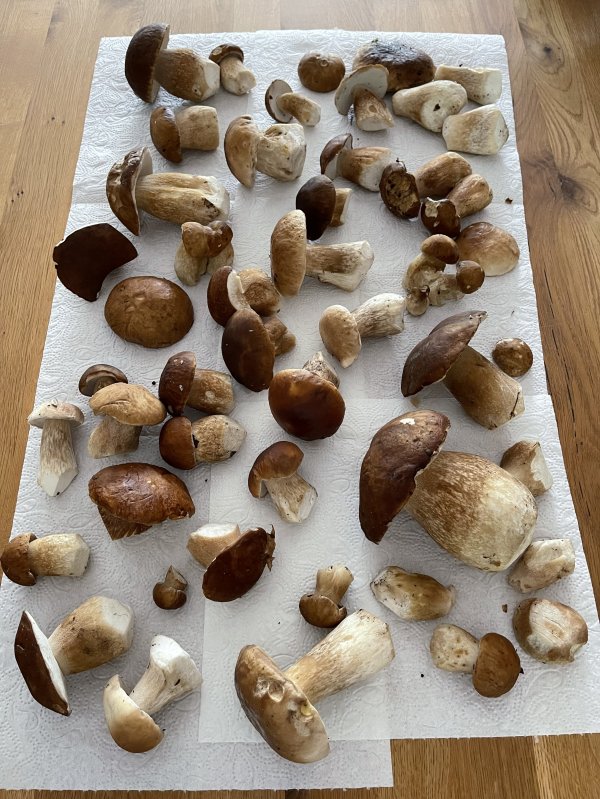 Unsere Ausbeute: einige sehr schöne Steinpilze, Goldröhlinge sowie einige Austernseitlinge. Gibt heute Abend mit Sicherheit ne schöne, frische Rahmpilzpfanne mit Butternudeln - da läuft mir jetzt schon das Wasser im Mund zusammen.
