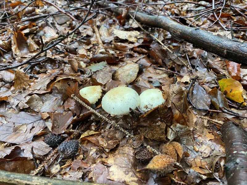 Der helle/weiße Pilze könnte ein gelber Knollenblätterpilz sein ,der kleine mit dem Dunklen Stiel evtl ein Knoblauchschwindlig. Wenn viele von denen wachsen kann man ihn oftmals reichen bevor man ihn sieht 😄
